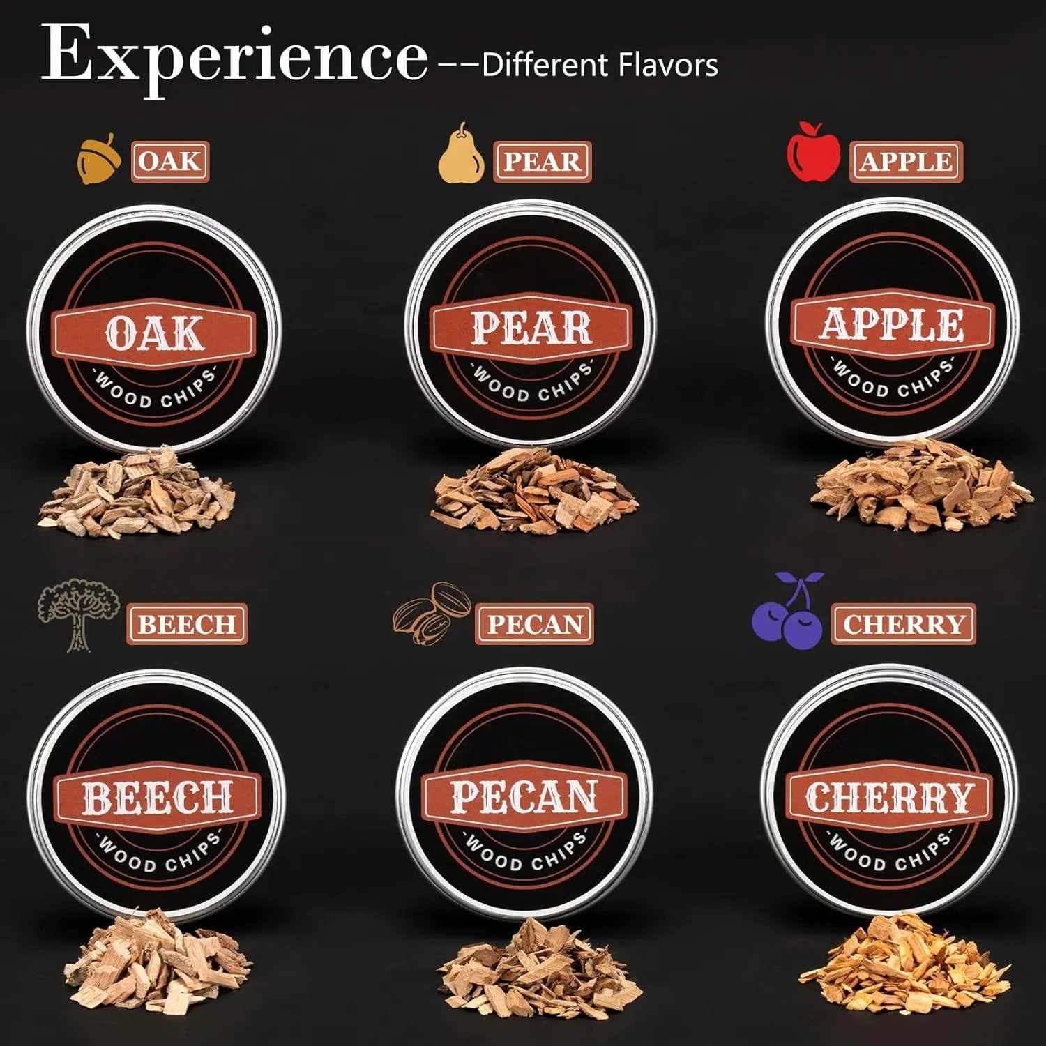 🥃 Complete Cocktail Smoker Kit Includes 6 natural wood chips—oak, cherry, apple, pear, hickory, and beech. Create rich smoky flavor for whiskey, bourbon, cocktails, and more in seconds.Elevate your drinks with authentic, smoky taste.