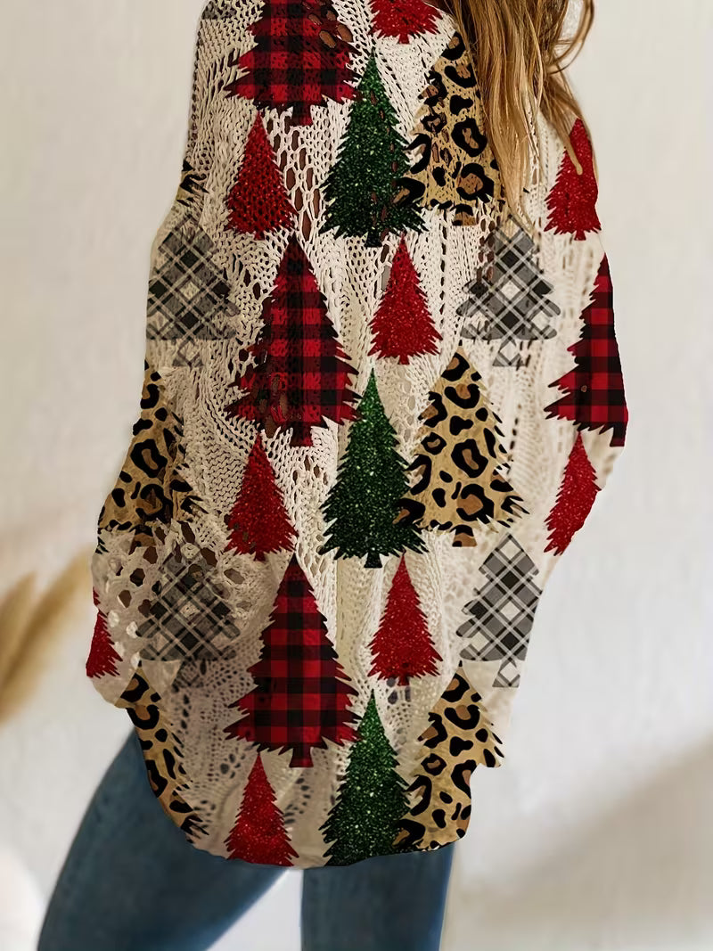 The playful mix of Christmas tree motifs, plaid accents, and leopard prints brings a fun, fashionable twist to the classic holiday sweater. Making it a fun pick for family gatherings, holiday parties, or casual winter outfits. Ideal for Christmas morning, festive photoshoots or embracing the holiday season